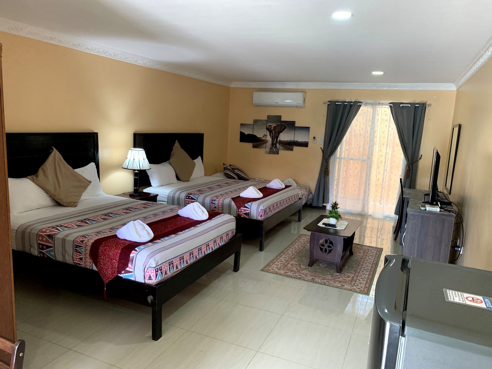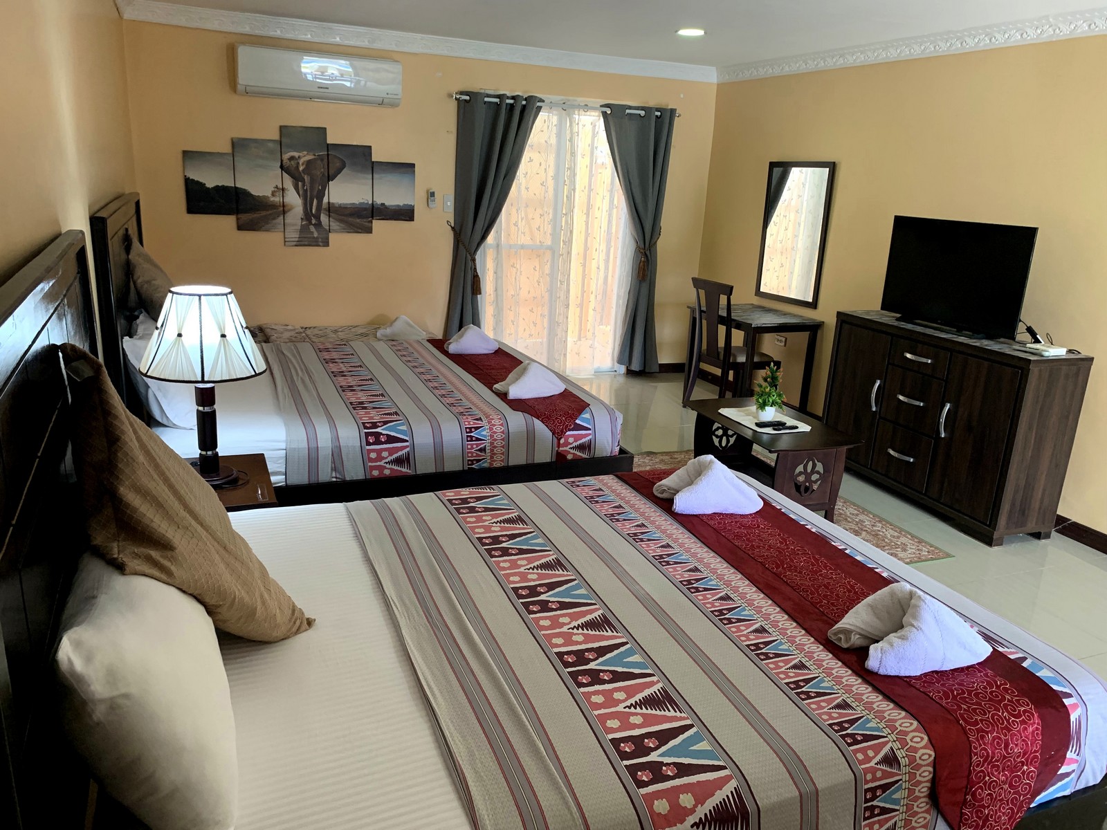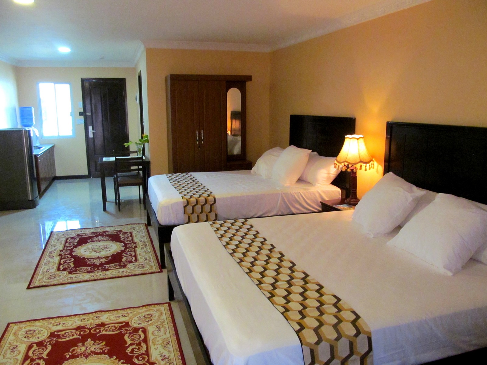 Family Suite, Approximately 46 sq.m. with one Queen sized beds, one king size bed, one Sofa bed, 43" LED TV with 72 digital cable channels, free wireless Internet access, shower with hot and cold water, Hair dryer, Fully stocked mini-bar, Tea and coffee-making facility, In-room large refregirator, dinning table w/ 2 chairs, and Safe deposit box available upon request. The Family Suite can accommodate a maximum of 4 adults.This is large suite with small kitchen, large refregirator, dinning table w/ 2 chairs, large private front terrace with recliner chair is perfect for your stay vacation or your fabulous getaway. Strategically located in front of the swimming pool.